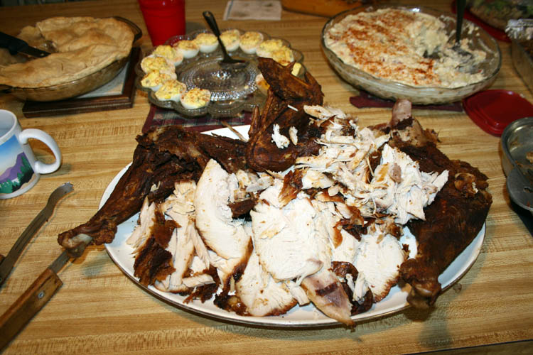 Deep fried turkey and apple pie, deviled eggs and potato salad in the back