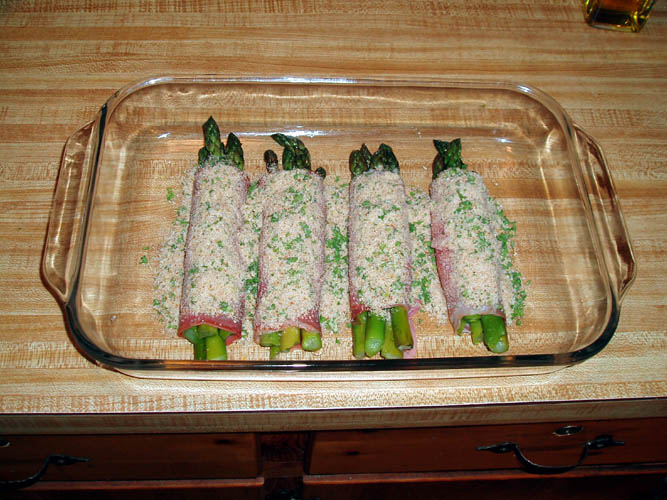 Recipe from Betty Crocker website.  Below pix of plated asparagus bundles with the perfect baked potato, venison cubed steak and gravy, toss salad,  French garlic bread and White Zinfandel wine served on 04-26-09 by Bill aka Mickey Porter: