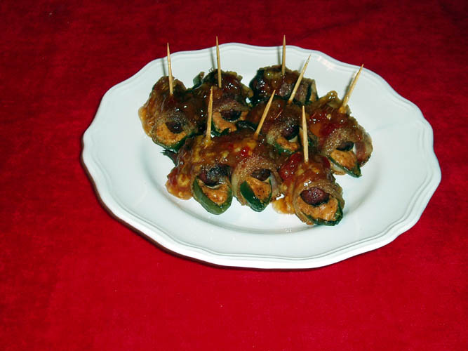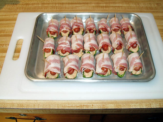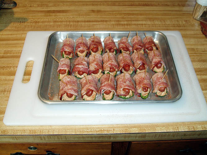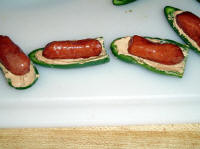 Using a butter knife, fill each jalapeno half with a generous portion of the