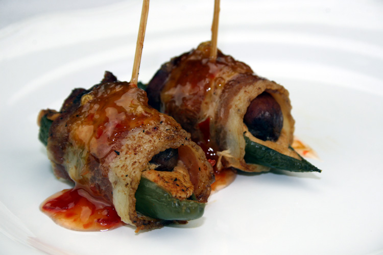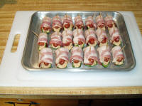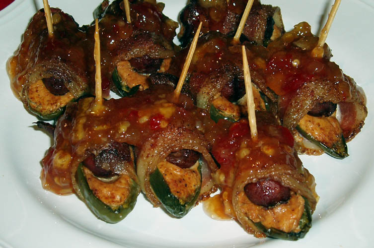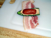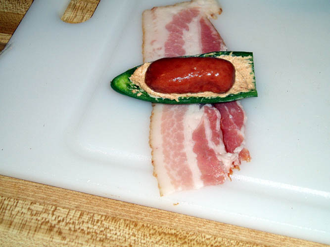 Wrap each of the smoky topped jalapenos with a half slice of bacon, making