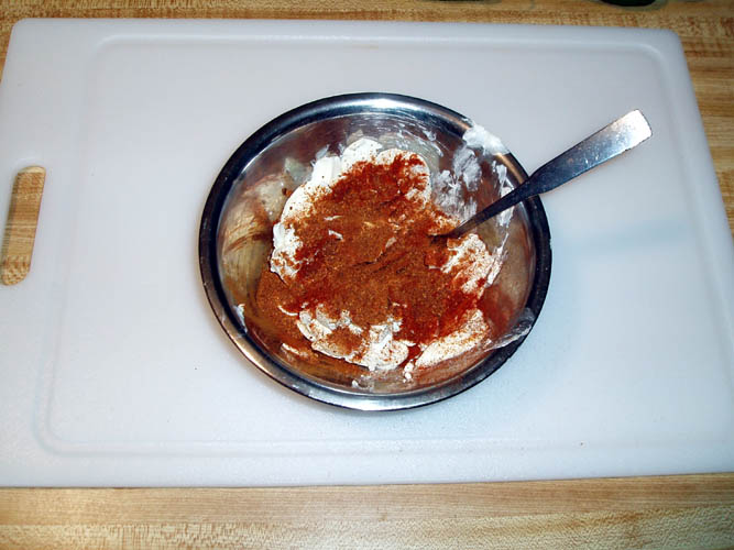 In a mixing bowl, combine the cream cheese, paprika and cayenne pepper.