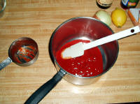 Many folks will boil the ribs for an hour or so to help tenderize them before placing them on the grill,  but the aluminum foil method will work on the BBQ grill outside or in the oven as today.  *You can add beer, wine or liquid of your choice to the roasting pan to help add additional flavors but the main reason is to steam tenderize the ribs and get them done enough before you start applying the bbq sauce.  This bbq sauce since it has sugar and ketchup will turn dark on you but it will certainly have you wondering why you have been purchasing "store bought" bbq sauce instead of making your own; whereas  most of the ingredients for commercial bbq sauces are already in your kitchen cabinets such as this bbq sauce recipe.   The sauce is a little on the spicy side and if you want to reduce the heat, leave out the cayenne pepper.  This bbq sauce is sweet, tangy with some heat and is a must for ribs!