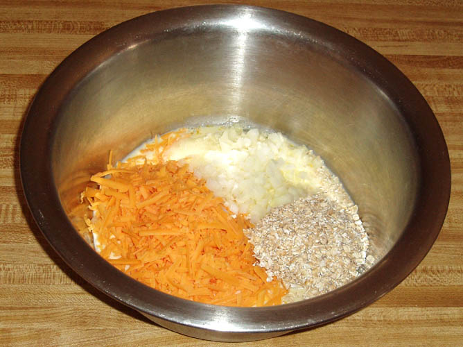 In a bowl, beat the egg and milk. Stir in cheese, oats, onion and