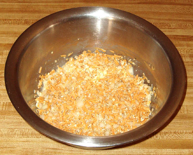 Shredded sharp cheddar cheese, 1/2 cup quick oats, onions and milk ready