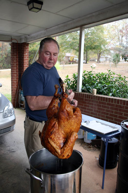 turkey slowly from the hot oil and allow excess oil to drain back into the