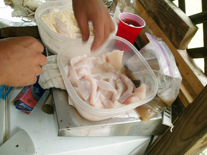Robert soaked the Crappie fillets and other Lake Tillery caught fish in a salt water solution, drained them and coated those