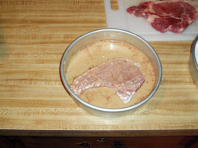 drench (wet) mixture in a shallow flat pan. Dip pork chop into dredge