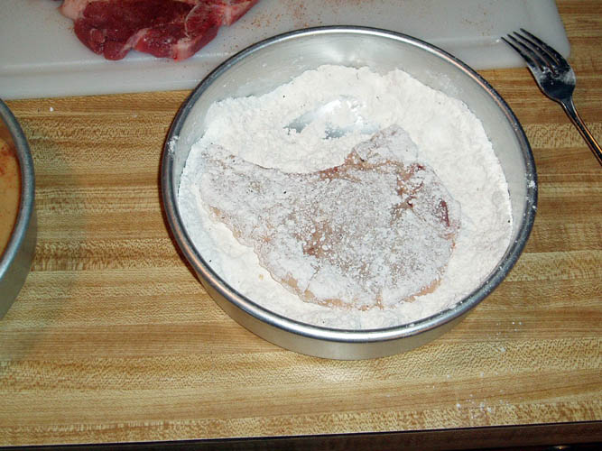 pork chops and let sit at room temperature for about 30 minutes. Prepare dredge (seasoned flour)
