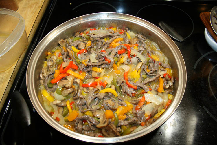 flattop grill to prepare the meat and veggies or two large 13 inch skillets, you can chop the meat into