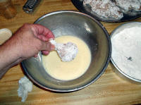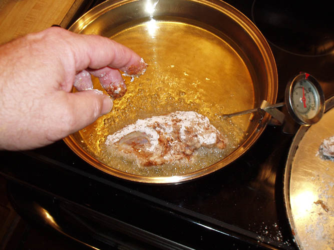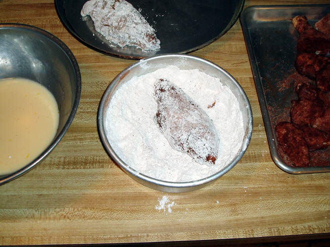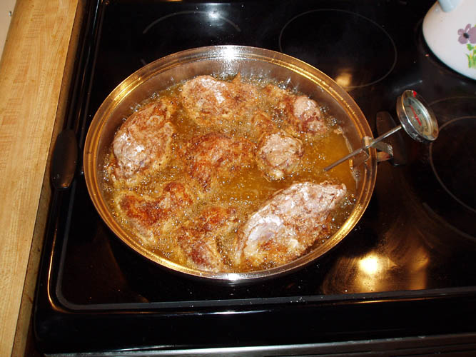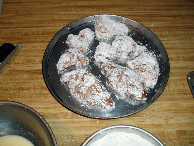and milk wash and dipped in seasoned flour. Very early on, most of those chickens