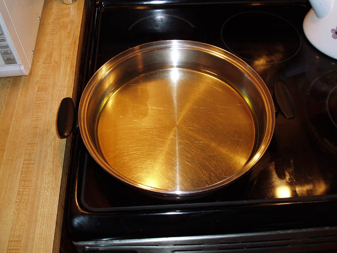 add enough oil to fill the frying pan to where the oil is at least 1/4 inch