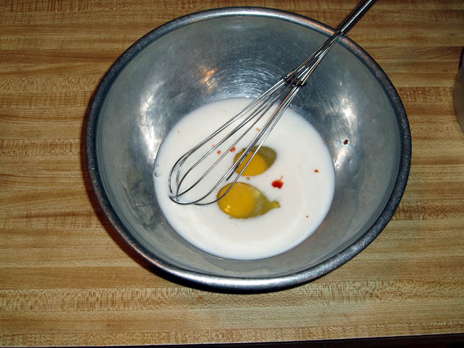 In a medium sized shallow flat bottomed bowl, beat the eggs, milk and hot sauce together. In