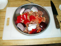 onions, and green peppers, and stir to coat. Cover and refrigerate for