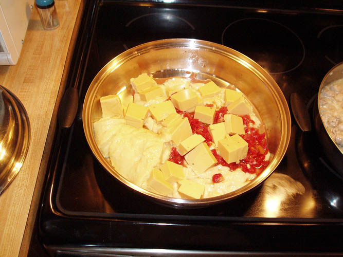 Velveeta cheese and add chicken broth to thin if necessary. Allow to