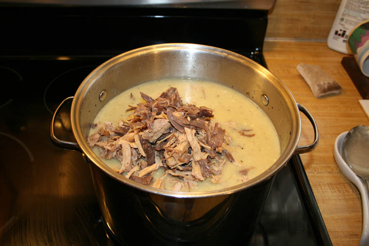 Boil on high/medium heat about 3 hours until turkey can be pulled from the bones; discarding the skin,